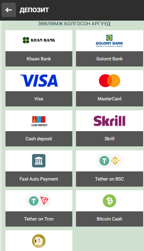 Монголоос тоглогчид дансаа цэнэглэх, хожсон мөнгөө авах 40 гаруй сонголттой. Төлбөрийн сонголттой танилцахын тулд програмын зүүн дээд буланд байрлах “+” товчийг дарна. Банкны карт болон төлбөр тооцоо, цахим түрийвч, төлбөрийн систем, криптовалют ашиглах боломжтой. Ихэнх сонголтууд нь шимтгэл авдаггүй бөгөөд мөнгө нь тоглоомын дансны үлдэгдэлд шууд ордог.