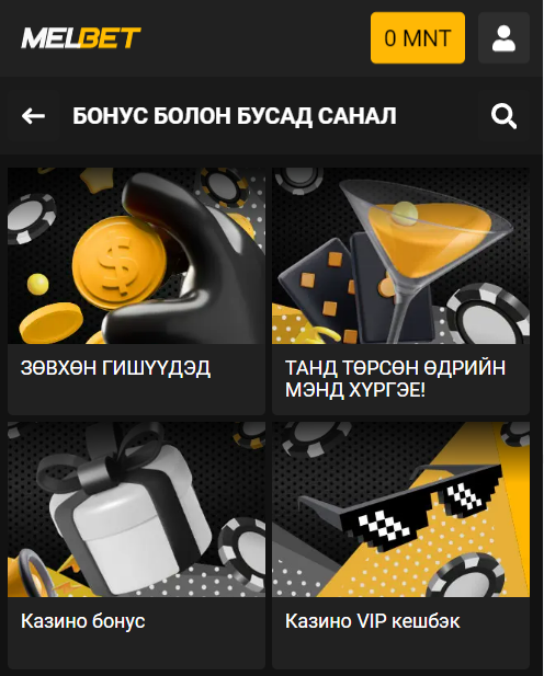Melbet урамшууллыг казино, спортын бооцоо, ерөнхий гэсэн 3 ангилалд хуваах бөгөөд Казино тоглогчдод дараах саналыг санал болгож байна: