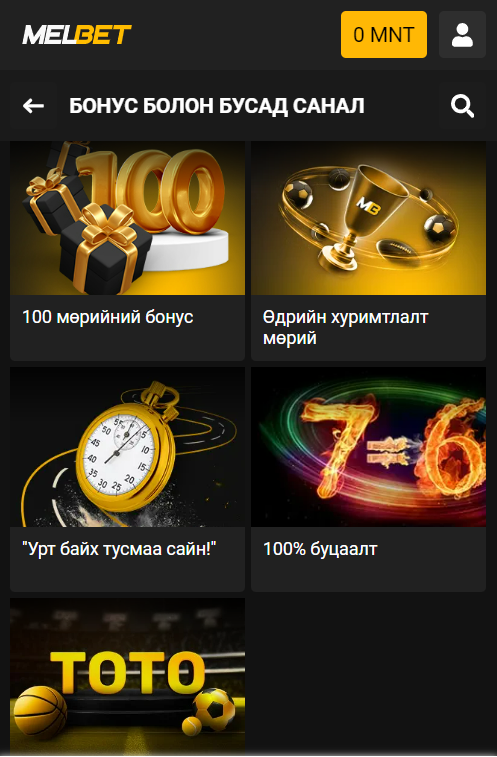 Аппын бүх хэрэглэгч Melbet урамшууллын хөтөлбөрт бүрэн хамрагдах боломжтой. Урамшууллын талаарх мэдээллийг баруун доод буланд байрлах “Menu” хэсгийн “Other” сонголтыг дарж тэндээс “Promotions” гэсэн хэсэг рүү нэвтрэнэ.
